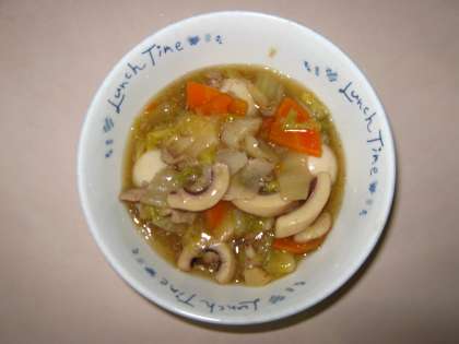 副菜は,旬の白菜を使った『八宝菜』です。豚肉・いか・にんじん・白菜・干ししいたけ・うずら卵・たけのこ・しょうがといろいろな具財が入り,彩りもきれいでした。