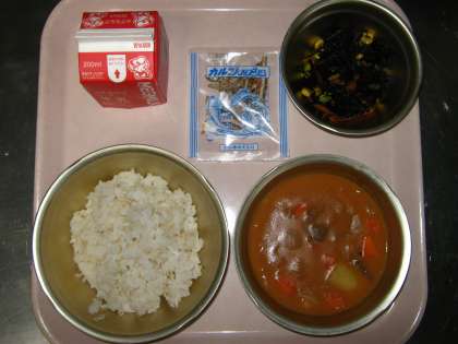 今日の給食は,『麦ごはん・牛乳・ビーフシチュー・ひじきのソティ・じゃこ』です。