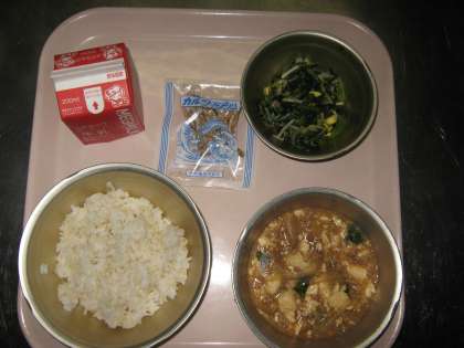 今日の給食は,『麦ごはん・牛乳・マーボどうふ・ほうれん草と大豆もやしの炒めナムル・じゃこ(カル)』です。