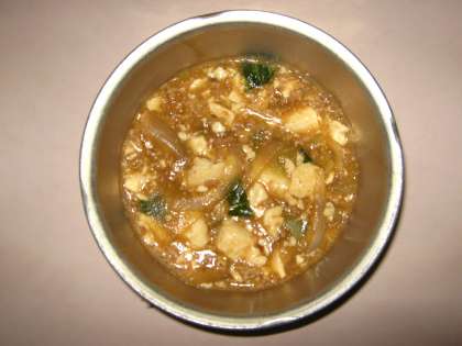 今月の豆腐料理は,「マーボどうふ」です。青味にチンゲン菜を入れました。中華料理の調味料のトウバンジャンやテンメンジャンも使っています。