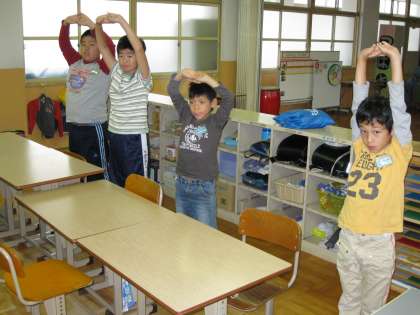 教育TVの番組「ストレッチマン2」を見ながら,4人そろって「伸びーる,伸びーる」なかなか見事なストレッチ。担任から促されることなく,4人そろって出来たのは初めての快挙!自発的に友だちを誘う子,促されてスムーズに立ち上がりストレッチを始める子,4人の気持ちと行動のタイミングがうまく合ったのでしょう。あっぱれ!