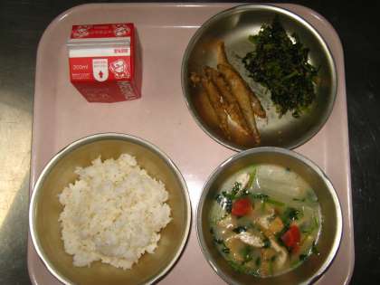 遅くなりましたが,12月7日(金)の給食は。『胚芽米ごはん・牛乳・わかさぎのこはく揚げ・だいこん葉のごまいため・京野菜のみそ汁』でした。