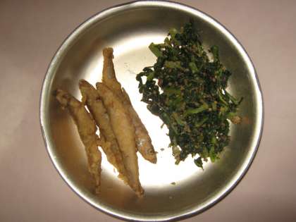 主菜の「わかさぎのこはくあげ」は,しょうが醤油で下味をつけてこはく揚げにします。カリッとして,頭からパクパク食べられます。お魚の苦手な子もおいしそうに食べていました。