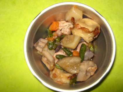 鶏肉と根菜類(ごぼう・れんこん・にんじん)・ちくわ・こんにゃく・三度豆を炒め煮にしました。根菜類やこんにゃくには,多くの食物せんいがふくまれています。根菜類の歯ごたえを楽しめたでしょうか。