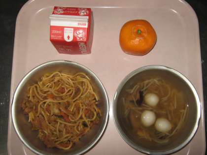 今日の給食は,『ソース焼きそば・牛乳・スープ・みかん』です。