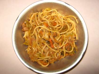 ソース焼きそば・・・中華乾麺・乾燥ためねぎ・乾燥にんじん・乾燥キャベツ・まぐろフレーク(袋)に生のキャベツ・たまねぎ