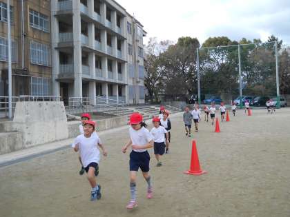 淀城跡見学 → 中間かけ足 → 体育 と,少しお疲れの子どもたちでしたが,本番とほぼ同じ距離を全員完走しました。