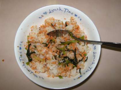 「まぜごはん」はセルフのまぜごはんです。教室で「さけとだいこん葉のまぜごはんの具」とごはんをおしゃもじ代わりのスプーンで,各自が上手に混ぜます。鮭のオレンジとだいこん葉のグリーンがごはんと混ざり,彩がとてもきれいです。