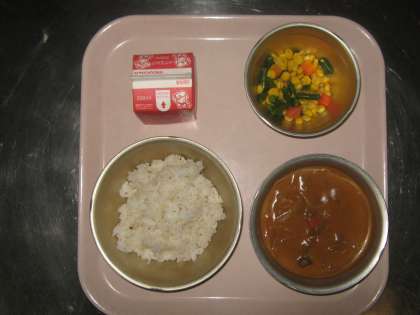 今日の給食は,『麦ごはん・牛乳・カレー・野菜のソティ』です。