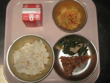 今日の給食は,『玄米ごはん・牛乳・さばのたつたあげ・三度豆の煮つけ・紅白なます』です。