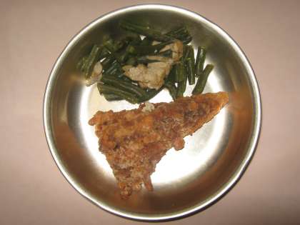 「三度豆の煮つけ」は,油揚げと一緒にけずりぶしのおだしで煮つけました。三度豆をかむと中からジワ〜とおだしがしみ出て美味しいです。三度豆の苦手な子も残さず食べていました。