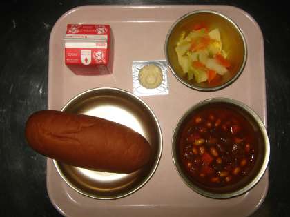 今日の給食は,『黒糖コッペパン・牛乳・チリコンカーン・野菜のホットマリネ・型チーズ』です。
