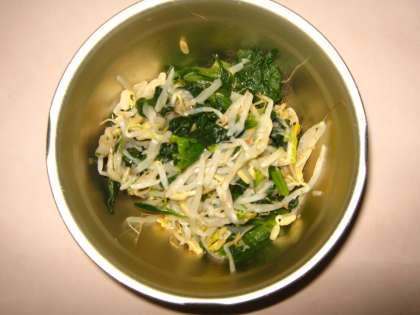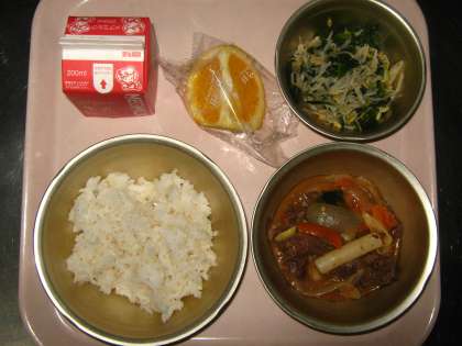 今日の給食は,『麦ごはん・牛乳・トッポギ・ほうれん草ともやしのいためナムル・はっさく』です。
