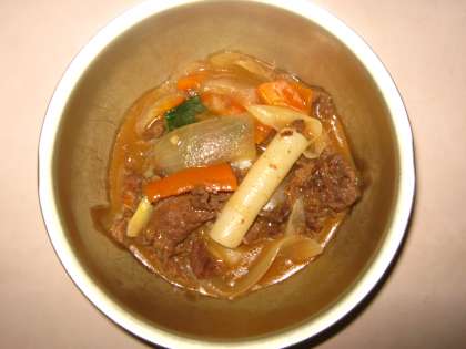 料理の名前も『トッポギ』といいます。牛肉・たまねぎ・にんじん・にんにくを炒め,さとう・しょうゆ・料理酒・コチジャンでピリッと味つけした後,トッポギを入れてやわらかく煮ます。