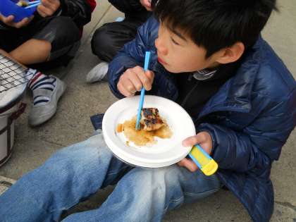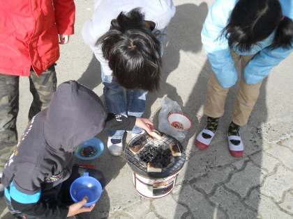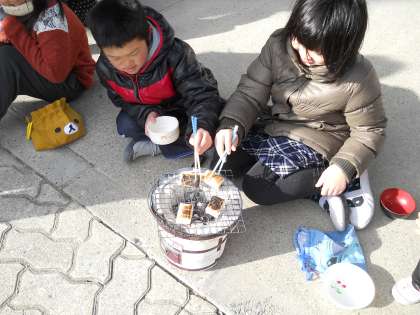 子どもたちはおもちの焦げ目を見て,「うわー,焦げてるぅ〜」とがっかりしていましたが,食べてみると香ばしくて「いつも食べてるのよりおいしい♪」と絶賛していました!