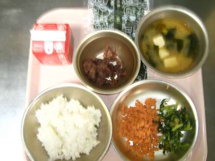 今日の給食は,『セルフおにぎり(梅さけ,牛肉のあまから煮・・6年)・牛乳・大根葉のごまいため・みそ汁』です。