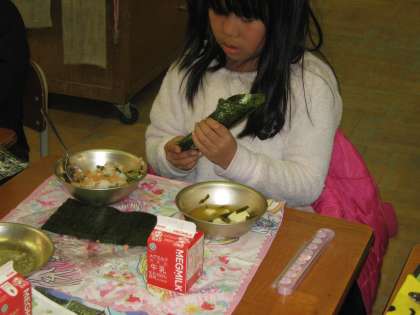 今日は6年生のお楽しみ給食です。6年生には,おにぎりの具がもう1品「牛肉のあまから煮」がつきます。「梅さけ」と「牛肉のあまから煮」の2種類の具を楽しむことができます。