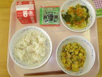 今日の給食は,『麦ごはん・牛乳・親子煮・はくさいの煮つけ・黒大豆(やわらか)』です。