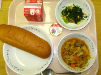 今日の給食は,『味つけコッペパン・牛乳・ボルシチ・小松菜のソティ・クリームチーズ』です。