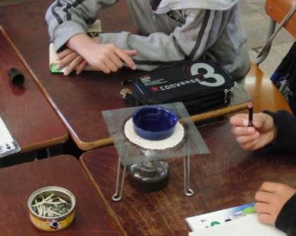 食塩の水溶液を蒸発皿で熱すると、食塩がでてくる。