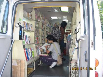 移動図書館車はマイクロバスを改造したもので,およそ2200冊の本が積み込まれています。車の中には本棚があり,ぎっしりと本が並べてありました。利用する人は中にはいってお目当ての本を探すのです。子どもの絵本から,大人向けの小説や専門書も見受けられました。