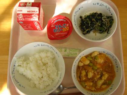 今日の給食は、『ごはん・牛乳・豆腐の四川風・ほうれん草ともやしのいためナムル・りんごゼリー』です。