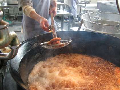 「とんかつ」は、給食室で揚げます。ロース肉に塩・こしょうをして,1枚ずつ小麦粉・卵・パン粉をつけて、油で揚げていきます。冷凍食品の「とんかつ」とは違い,衣も薄く,食品添加物の心配もありません。