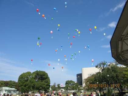 素晴らしい秋空の下,約300名の児童や保護者,教職員が京都競馬場の「緑の広場」に集いました。今年は,本校の6年生が交流学年として参加しました。一緒に走り,踊り,大きな声援を送っていました。フィナーレはメッセージをつけて風船を飛ばしました。(もちろん土に還る風船です。)