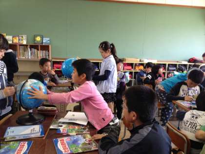 社会「わたしたちの国土」の学習で、地球儀の見方を勉強し、日本の位置を確認しました。