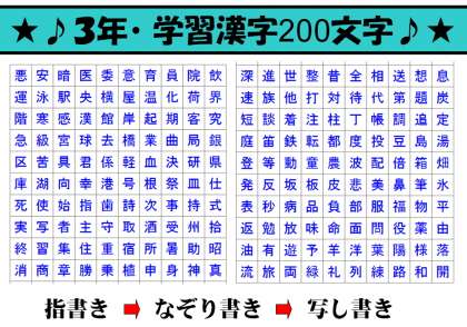 小学校3年生で習う漢字の一覧です。 3年生で習う漢字は200文字です。