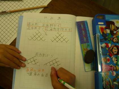 今日,正方形と長方形を方眼紙に書き,対角線に切り,直角三角形を作りました。