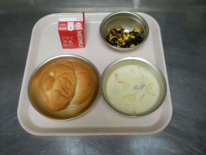 4月16日の給食は,「バターうずまきパン・牛乳・じゃがいものクリームシチュー・ひじきのソティ」でした。じゃがいものクリームシチューのルーは,手作りです。