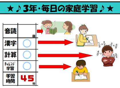 それぞれの内容は,毎日同じではありません。しかし,毎日,毎日, <音読・漢字・計算・チャレンジ学習>をします。