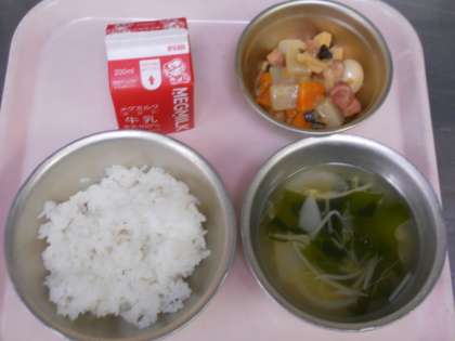 4月17日の給食は,「ごはん・牛乳・プリプリ中華いため・わかめスープ」でした。