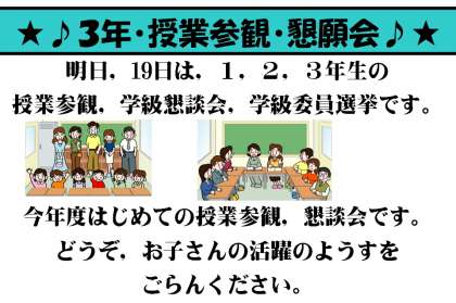 明日,19日は,1,2,3年生の授業参観,学級懇談会,学級委員選挙です。