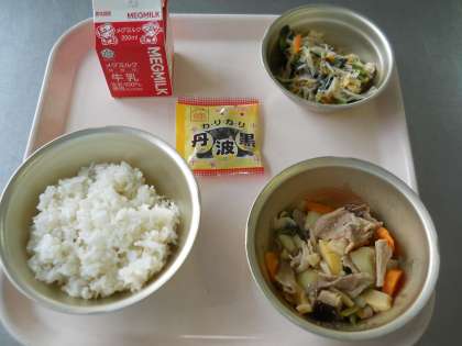 4月18日の給食は,「麦ごはん・牛乳・豚肉と野菜の煮つけ・もやしの煮びたし・黒大豆」でした。豚肉と野菜の煮つけは,けずりぶしからとっただしとしいたけのもどし汁を使った煮汁でじっくり煮こんだので,うまみがつまっていておいしく,好評でした。