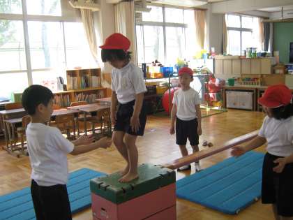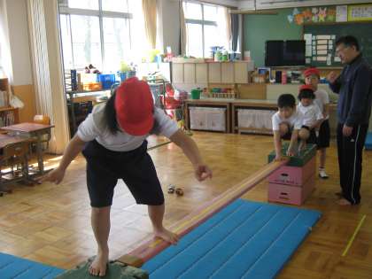 遊具運動では,1年生は初めて一本橋を渡りました。