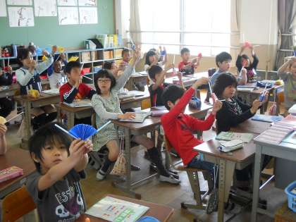 「角とその大きさ」の学習を進めています。色紙とストロー2本を使って作成した扇を使い,角の大きさを回転量としてとらえています。「私のつくった角は何度くらいでしょう?」そんな児童の発問にみんな一生懸命答えようとしているところです。