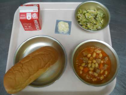 4月23日の給食は,「味つけコッペパン・牛乳・ポークビーンズ・ツナとキャベツのソティ・チーズ」でした。ポークビーンズは,大豆・豚肉・たまねぎ・にんじんをトマト味でじっくり煮込みました。豆が苦手な子もいましたが,がんばって食べていました。