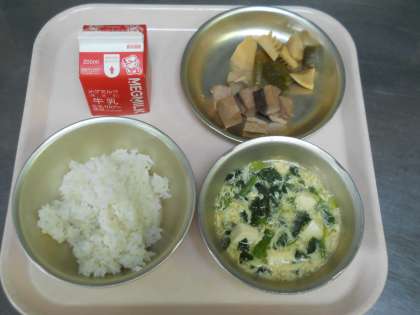 5月2日の献立は,「麦ごはん・牛乳・なま節とふきの煮つけ・かきたま汁」でした。