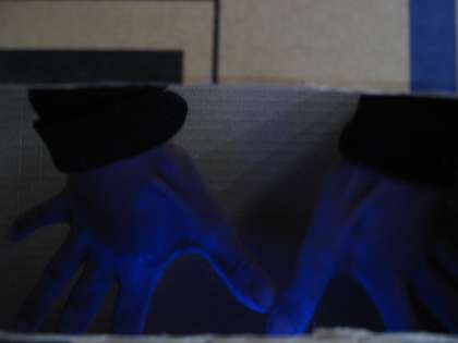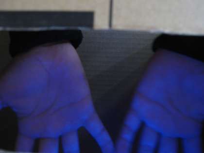 ブラックライトに照らすと、手洗いで落ちていないところが光ります。