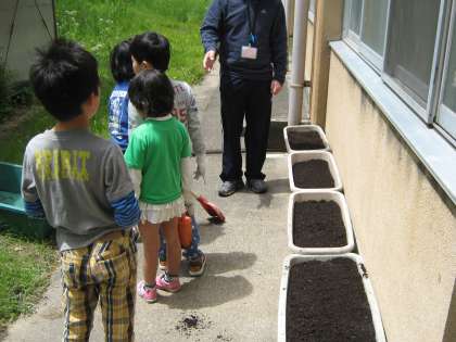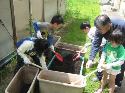 みんな,一生懸命土を運び,プランターにせっせと入れていました。