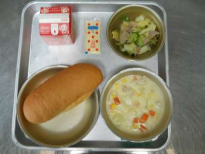 コッペパンにサラダ油,塩,コショウで味付けしたハム,タマネギ,キャベツ,キュウリを乗せます。そして,マヨネーズソースをかけたらハムサンドの出来上がり。鶏肉,ジャガイモ,タマネギ,ニンジンがたっぷり入ったコーンクリームシチューも召し上がれ。真夏のような暑さには,冷たい牛乳がとってもよく似合います。