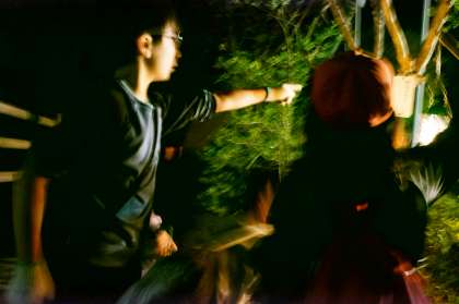 暗い森をロウソクランタン1つの明かりで、蛍光リングの明かりを目印に進みます。