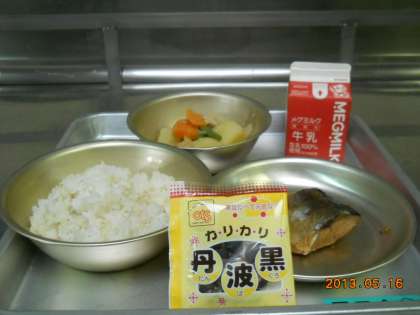 今日の給食のメニューは、麦ごはん・さばのしょうが煮・鶏肉と野菜の煮つけ・黒大豆・牛乳です。