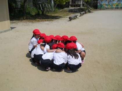 1年生では,体育科で「ころがしドッジボール」をしています。初めに「男の子対女の子」でルールに慣れるために練習試合をしました。前半と後半の間に「作戦タイム」をとりました。すると…。なんとかわいい♪円陣を組み,「せーの」で一斉にころがそう!・「散らばってあたらないように逃げよう」など,作戦を立てていました。