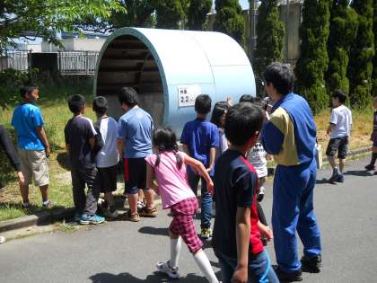 高い所から,窓越しに施設全体を見学しています。なんせ敷地が広いので・・・。足元には最終沈殿池がありました。ここで活性汚泥をゆっくり沈め,その上ずみを消毒して宇治川に流されます。また,実物大の下水管の太さに驚きました。内径2.4mです。