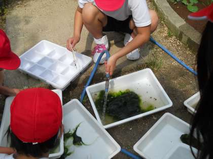 ビオトープとは,もともとはドイツ語で,「生きものたちが,生きているところ,生きもののすみか」という意味です。コケを取り出し水生昆虫を見つけ出します。水生昆虫といっても脚の有無,羽の枚数などによって分類されていることを知りました。
