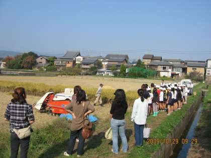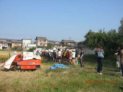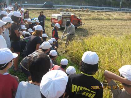 5年生の稲刈りには,5名の地域の方にご指導いただき,10名近い保護者の方に手伝っていただきました。カマが見つからないハプニングがありましたが,晴天の下,刈取りが進みました。コメは,12月6日に行われる,社会福祉協議会の「餅つき大会」に使われます。