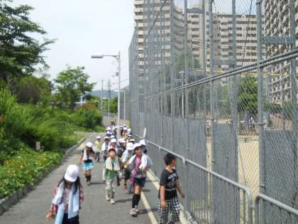 遊んだあとは,学校への帰路につきます。